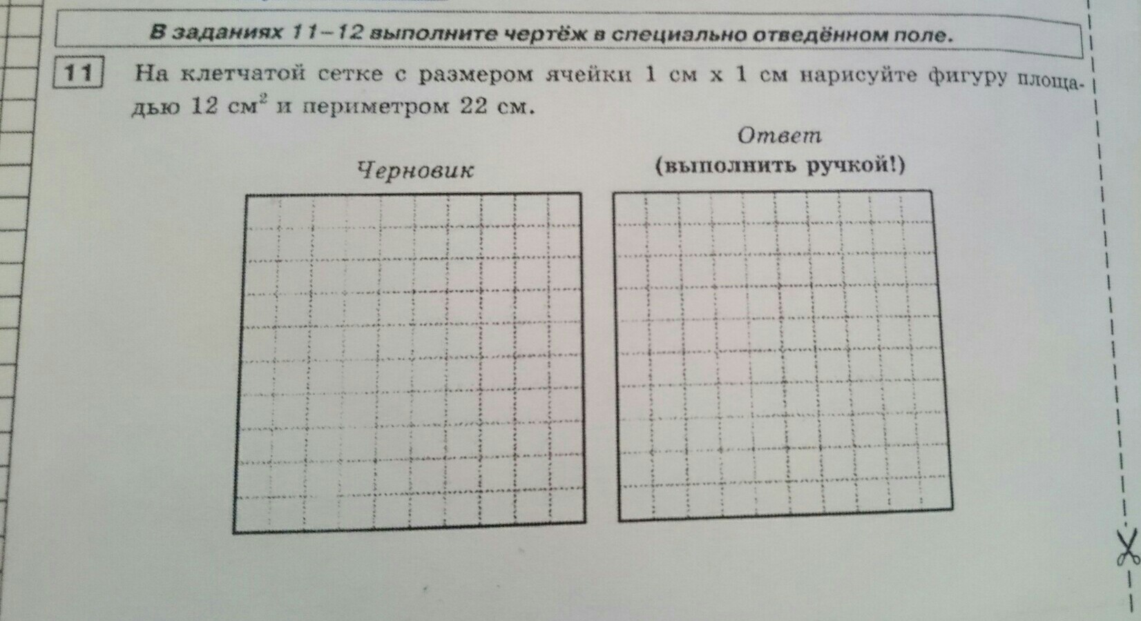 клетчатый сетки с размером ячейки 1см X 1см Нарисуйте фигуру площадью 12 см квадратных и периметром 22 см