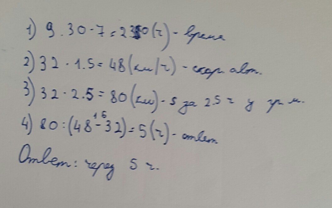 Из города в 7 час.утра вышла грузовая машина со скоростью 32 км в час. В 9 час. 30 мин. утра из того же города по тому же направлению вышел автобус, скорость которого в полтора раза больше скорости грузовой машины. В какое время и на каком расстоянии от города автобус догнал грузовую машину?