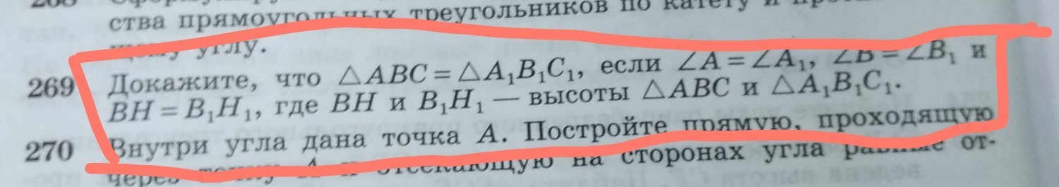 То будет 2 треугольника : АБН и БНС. Высота - это ведь перпендикуляр. Значит, если А=А1, Б=Б1, Вн=В1Н1, то они равны по трем углам (С= 180-А-Б)(С=С1)