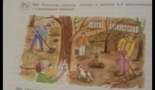 Папа копает ямы,а моя сестра красит дерево.Дружелюбный пёсик по кличке Ник бегает,а я таскаю вёдра.Мой друг Валера помогает нам, проводит граблями по земле