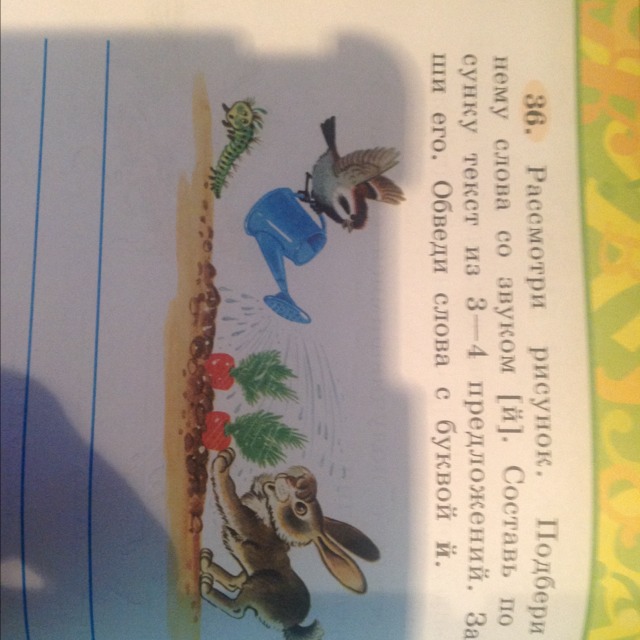 ЗаЙка с птичкой выращивали морковку.Каждый день птичка поливала её,а заЙка прогонял гусениц,которые хотели съесть его морковку.Благодаря хорошему уходу за морковкой,она выросла большой и вкусной.