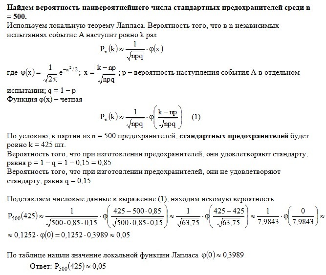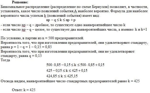 При изготовлении предохранителей 15% из них не удовлетворяют стандарту. Каково наивероятнейшее число стандартных предохранителей в партии из 500 штук?(ответ 0,017) помогите расписать!