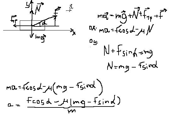 а чему равно Fcos альфа - М(mg - Fsin альфа) /m ?