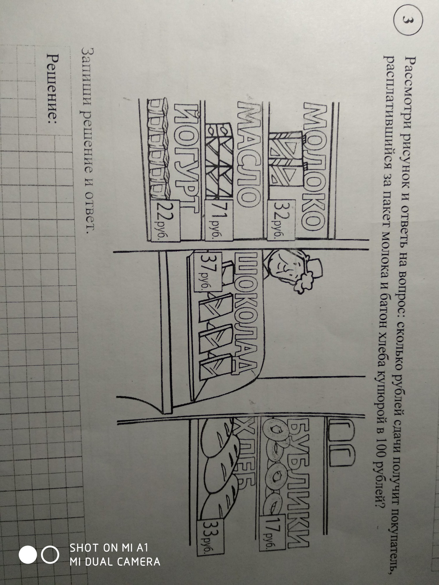 рассмотри рисунок и ответь на вопрос: сколько рублей сдачи получит покупатель, расплатившийся за пакет молока и батон хлеба в 100 рублей?
