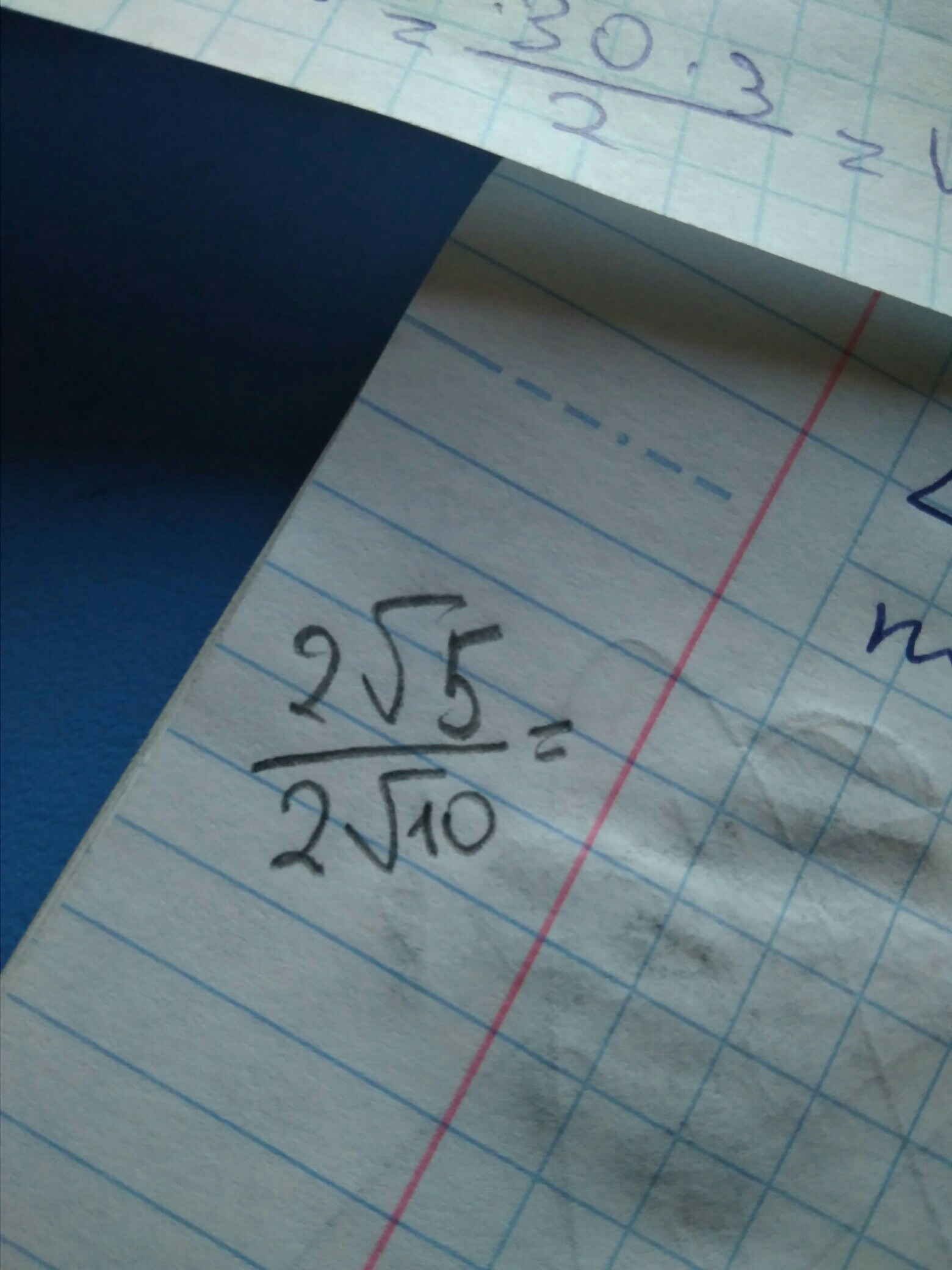 frac{2 sqrt{5} }{2 sqrt{10} }  =  frac{1}{ sqrt{2} }  =  frac{ sqrt{2} }{2}