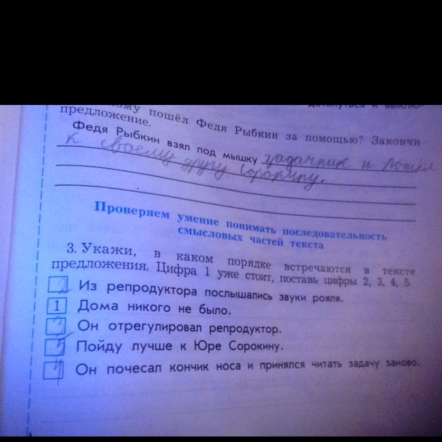 Укажи в каком порядке встречаются в тексте предложения . Цифра 1 уже стоит , поставь цифры 2 3 4 5 ( Н Носов Федина задача)
