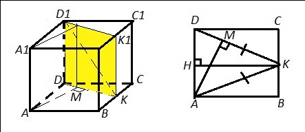 Расстоянием от АА1 до D1K будет расстояние от АА1 до DD1K1K , т.к. АА1 параллельна плоскости DD1K1K ( прямая АА1 параллельна прямой DD1, лежащей в пл. DD1K1K ⇒ AA1║DD1K1K). А это расстояние = расстоянию от т. А до пл. DD1K1K . Проведём АМ⊥DD1K1K ( AM⊥DK и АМ⊥DD1).