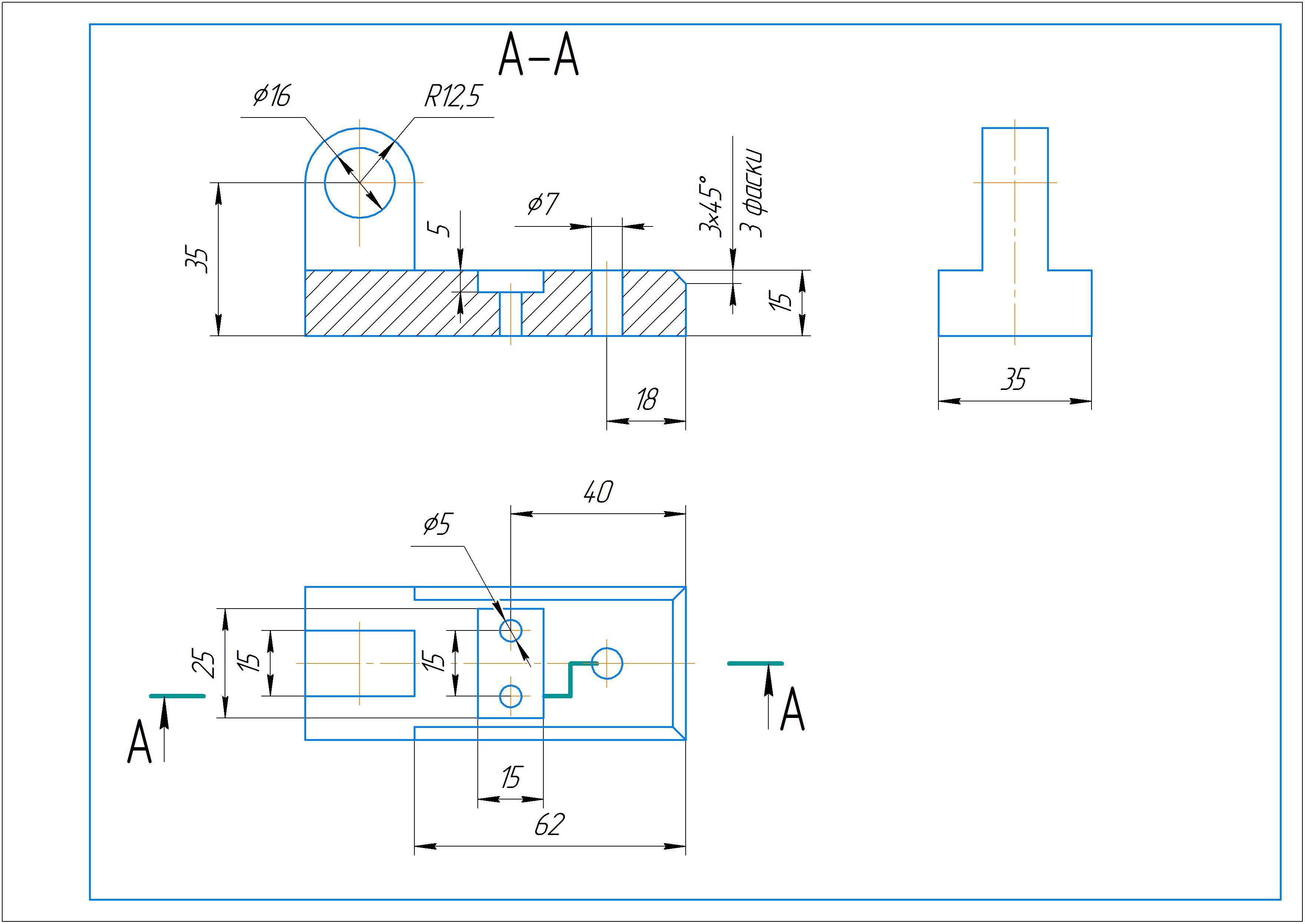 По этому изображению,нужно сделать вид слева,на виде сверху обозначить,а на виде спереди выполнить сложный ступенчастый разрез.Размеры с чертежа