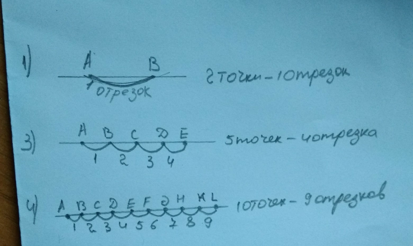 на прямой отмечены1)2. 2)3. 3)5. 4)10. точек. сколько отрезков образуется в каждом случае.? прошу решение с формулой и объяснением