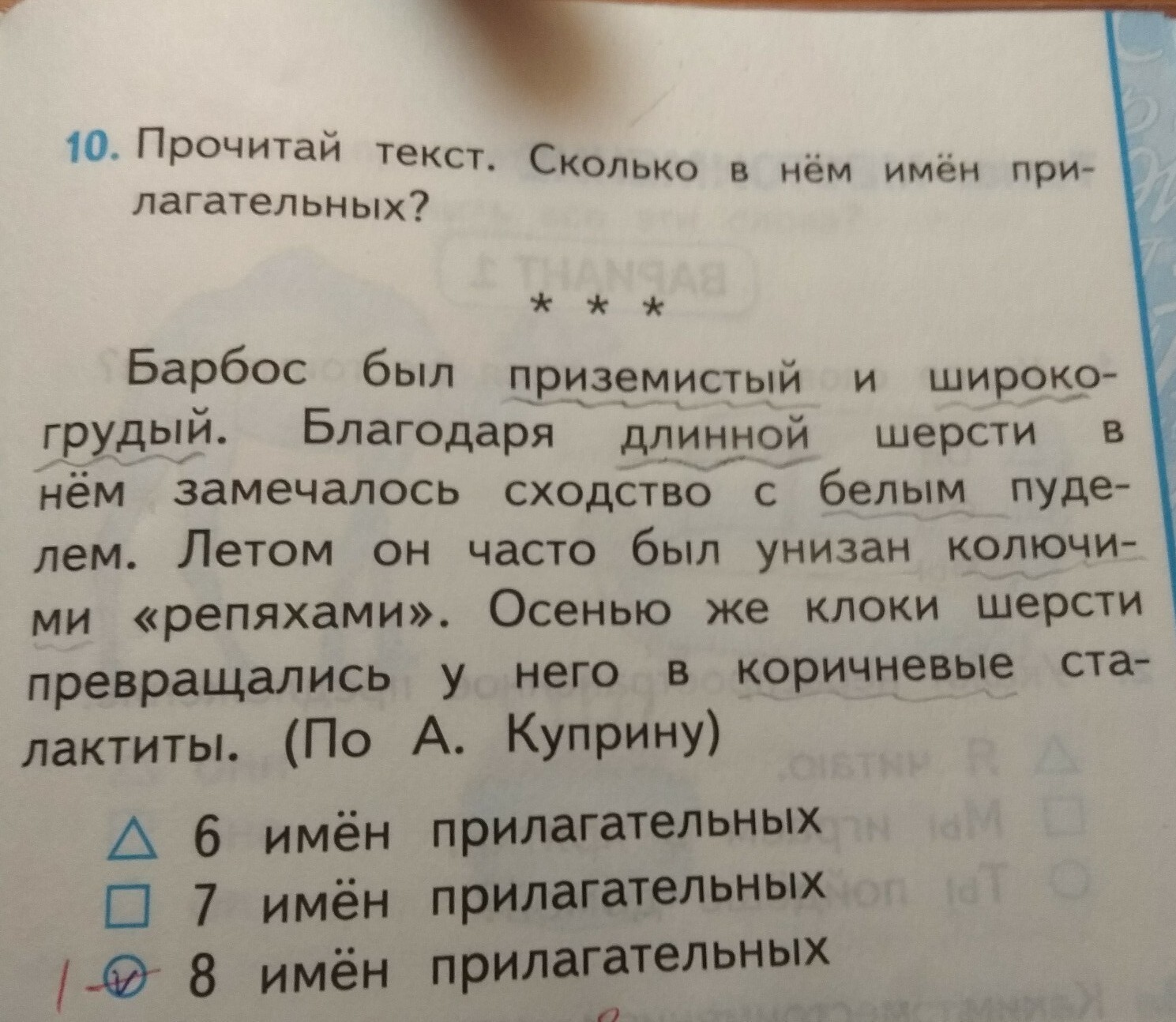 Прилагательные - приземистый, широкогрудый, длинной, белым, колючими, коричневые.