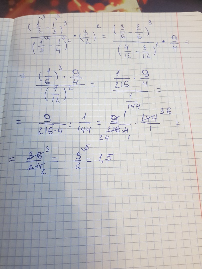 (1/2-1/3) в кубе : (1/3-1/4) в квадрате X (3/2) в квадрате напишите подробные решения с ответами ЗАРАНЕЕ СПАСИБО! УЖЕ НЕ НАДО!!!