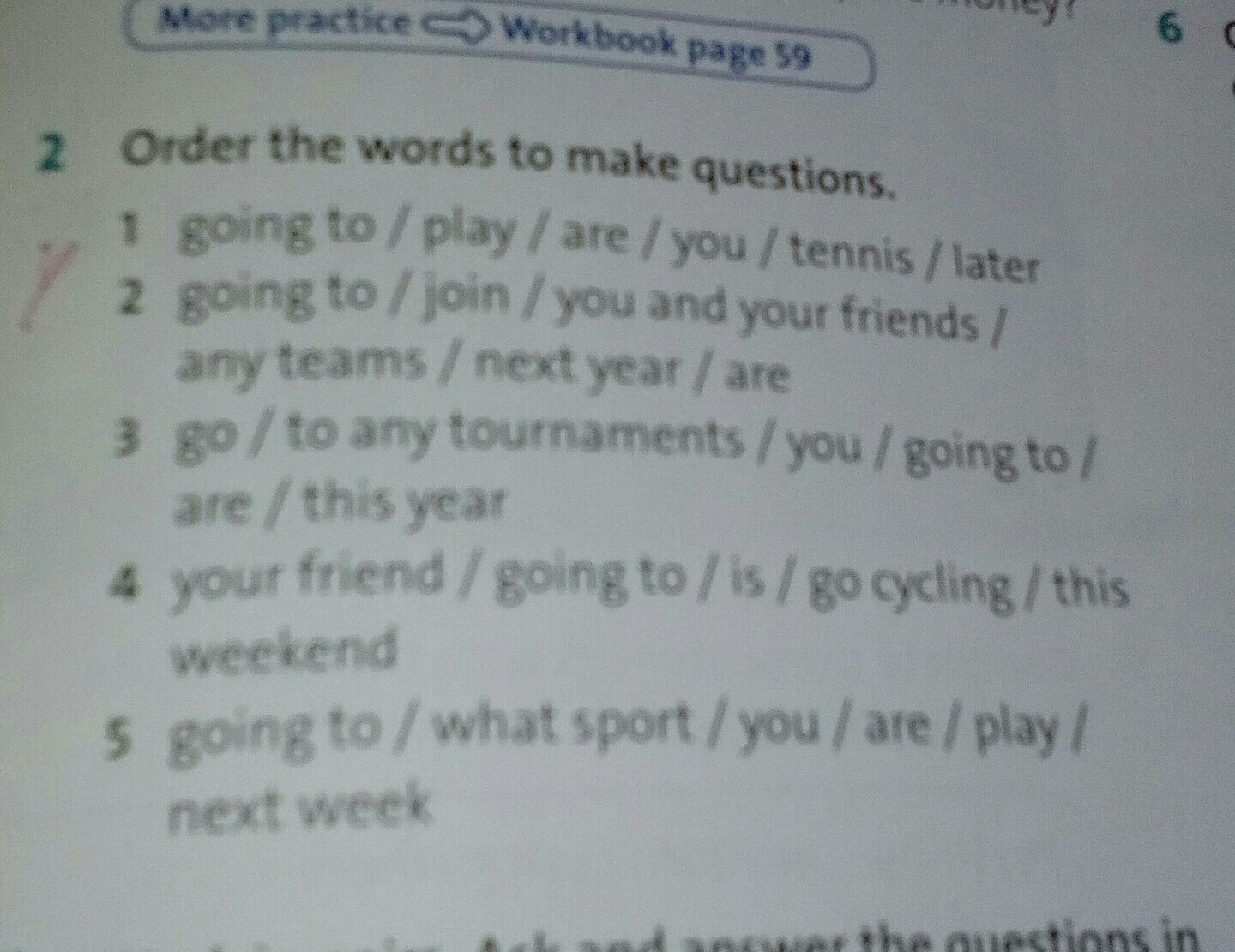 1. Are you going to play tennis later?2. Are you and your friends going to join any teams next year?3. Are you going to go to any tournaments this year?4. Is your friend going to go cycling this weekend?5. What sport are you going to play next week?