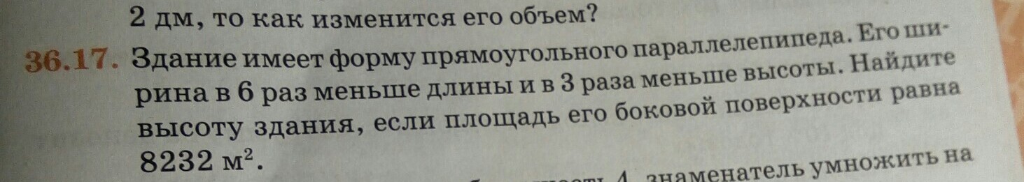 Здание имеет форму прямоугольного параллепипеда. Его ширина в 6 раз меньше длины и в 3 раза ментше высоты. Найдите высоту здания, если площадь его боковой поверхности равна 8232 м в квадрате.