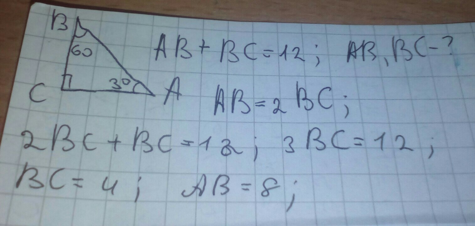№1 Дано:ΔABC-прямоугольный,∠В=60°,АВ+ВС=12см.