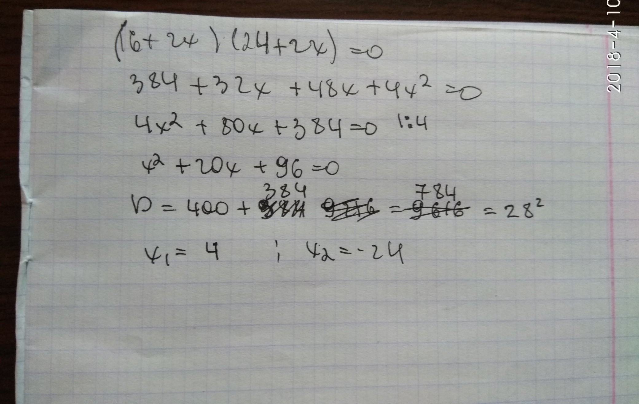 Ребята ! Помогите пожалуйста ! Очень сложно , сильно туплю ! Вот пример - ( 16+2х)*(24+2х) , вот если это перемножить , то получается " 384 +32 * 48 х + 4х " так ведь ? А что дальше то делать ? Надо дискриминантом считать , а как запись продолжить ? Объясните пожалуйста , как вообще эти примеры решать