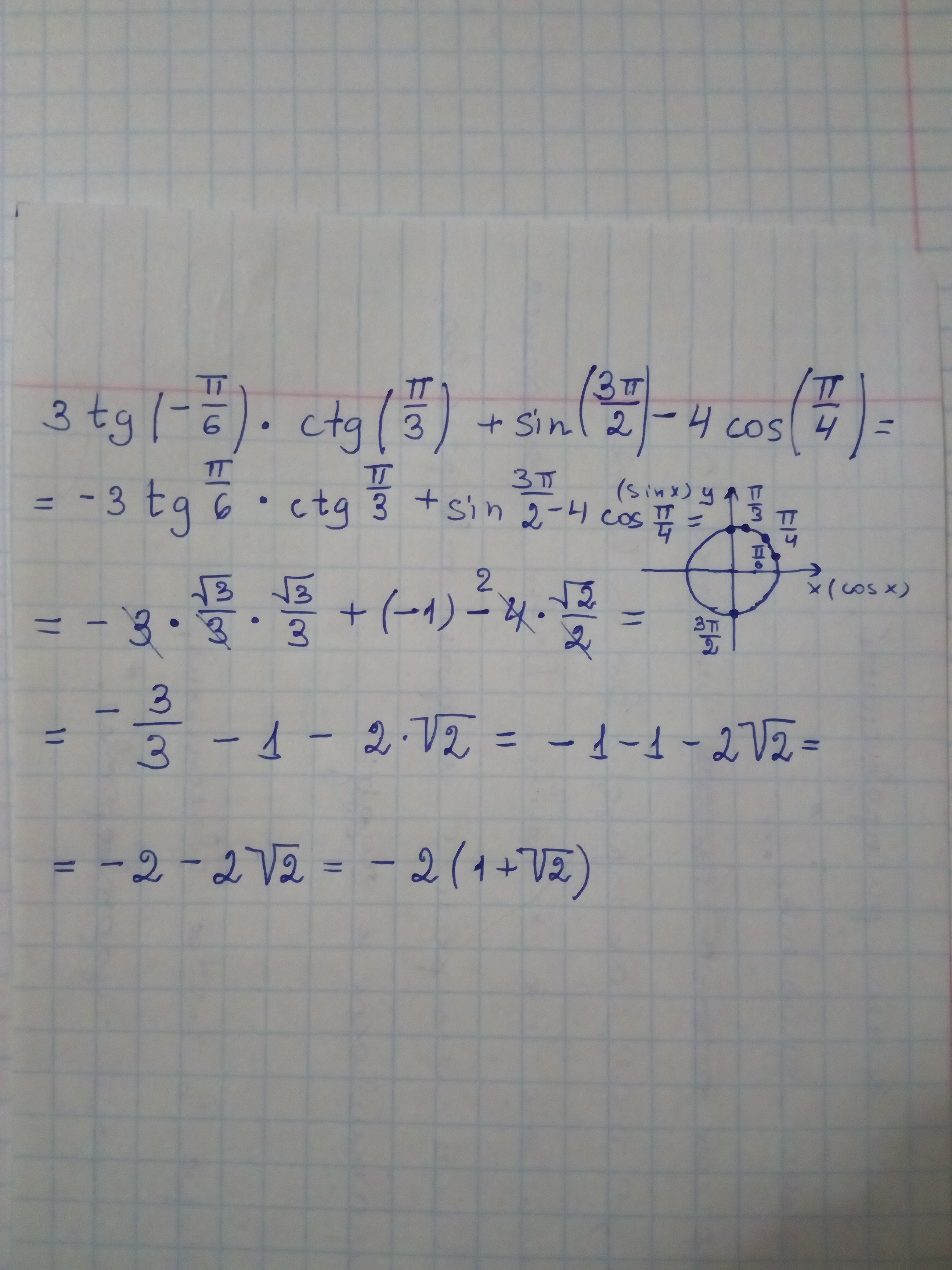 3tg (-П/6) * ctg П3 + sin 3П2 - 4cos П/4