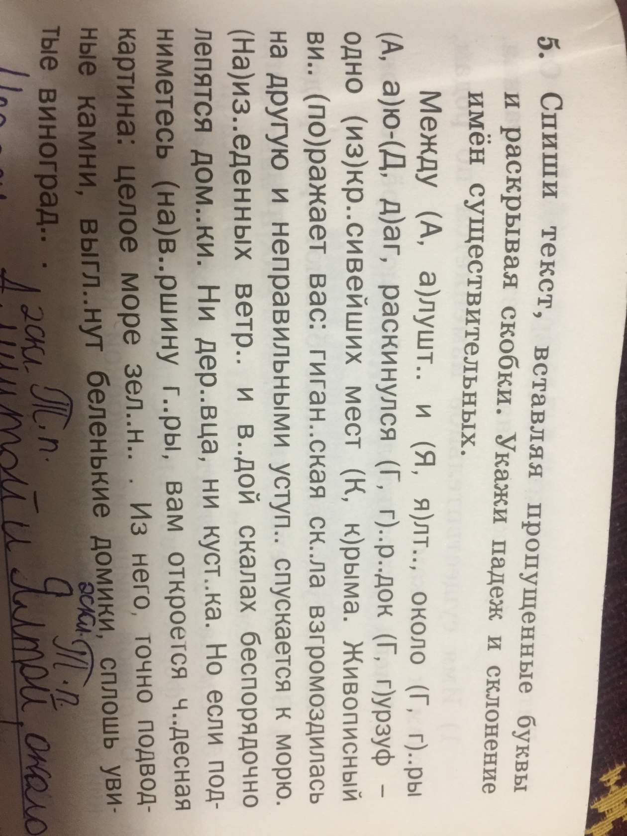 Между Алуштой (П.п., 2скл)и Ялтой (П.п., 2 скл) горы (В.п.) Аю-Даг, раскинулся городок (И.п., 2скл) Гурзуф (И.п., 2скл) - одно из красивейших мест (И.п., 2 скл) Крыма (Р.п., 1скл) . Живописный вид (И.п., 2скл) поражает вас: гигантская скала (И.п. 1 скл) возгромоздилась на другую и неправильными уступами (Т.п.1скл) спускается к морю (Д.п.2скл). Наизъеденных ветер (Т.п. 2 скл) и водой (Т.п. 2 скл) скалах (Т.п. 2 скл) беспорядочно лепят домики (Т.п. 2 скл). Ни деревца(И.п. 3скл), ни кустка (И.п. 2скл). Но если подниметесь на вершину горы (И.п. 1 скл), вам откроется чудесная картина(И.п. 1 скл): целое море (и.п. 3 скл) зеленое. Из него, точно подводные камни (И.п. 3 скл), выглянут беленькие домики (И.п. 2 скл) , сплошь увитые виноградом (Т.п. 2 скл)