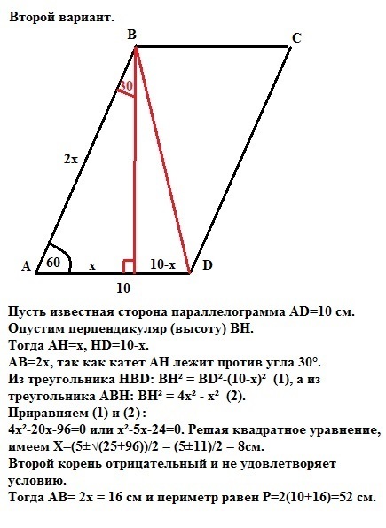 Одна зі сторін паралелограма дорівнює 10 см, менша діагональ - 14 см, а гострий кут - 60 градусів. Знайдіть периметр цього паралелограма.