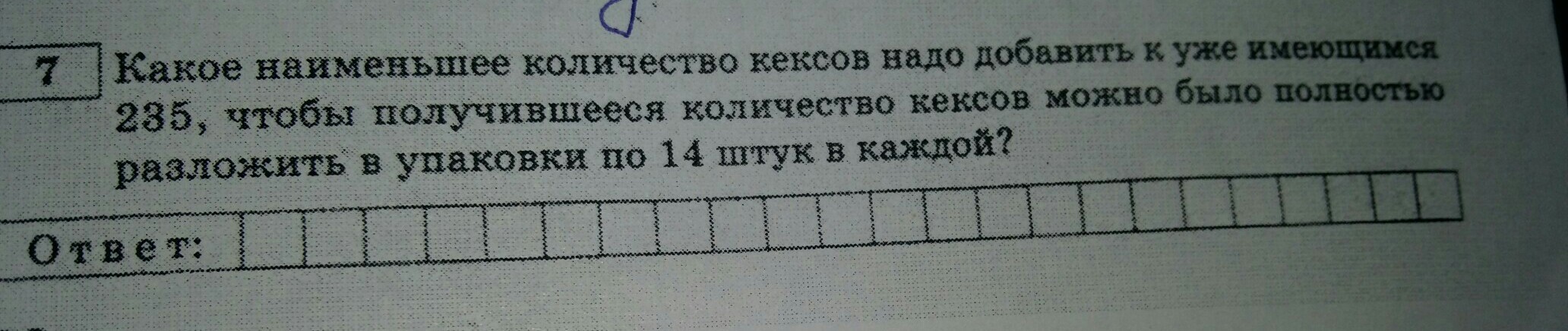 Какое наименьшее количество кексов надо добавить к уже имеющимся 235а чтобы получившееся количество цветов можно было полностью разложить в упаковки по 14 штук в каждой Помогите пожалуйста срочно плиз