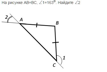 На рисунке AB=BC, ∠1=1630. Найдите ∠2