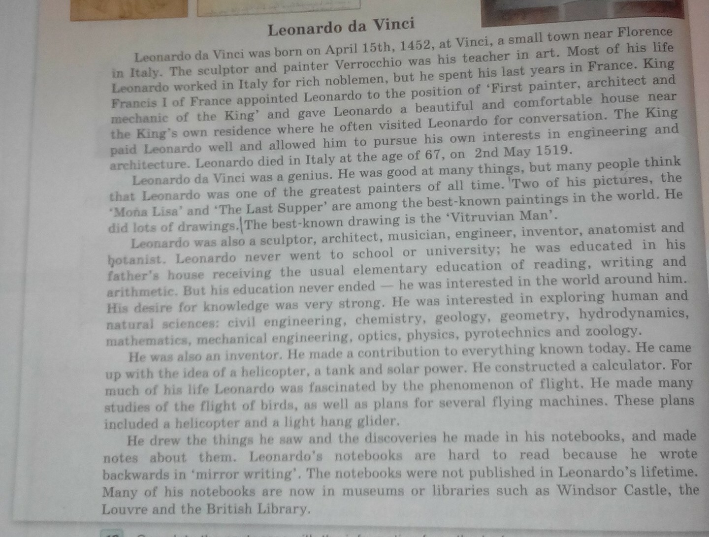 Леонардо работал в Италии у богатых дворян, но последние годы провел во Франции. Царь