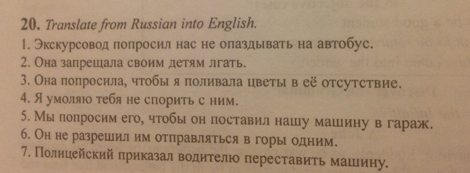 The guide asked us not to be late for the bus. She forbade her children to lie. She asked me to water the flowers in her absence. I beg you not to argue with him. We'll ask him to put our car in the garage. He did not allow them to go to the mountains alone. The policeman ordered the driver to rearrange the car.