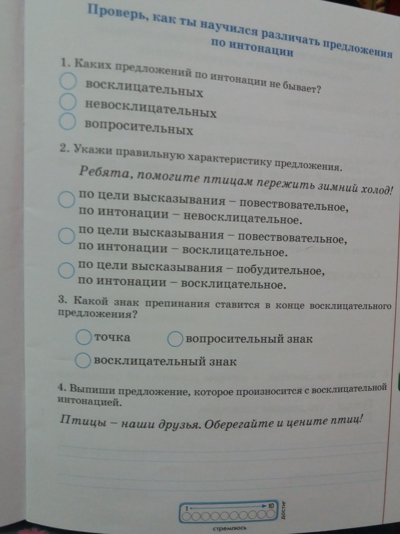1.Каких предложений по интонации не бывает? 2.Укажи правильную характеристику предложения. 3. Какой знак препинания ставится в конце восклицательного предложения? 4. Выпиши предложение которое произносится с восклицательной интонаций.