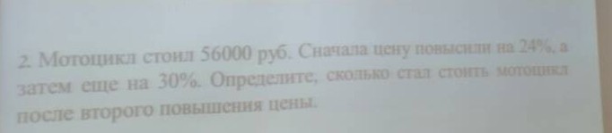 После повышения цена составила 124% от первоначальной, то есть 56000 · 1,24 = 69440 руб. После этого цену повысили еще раз, значит, она составила 130% от уже повышенной цены: 69440 · 1,3 = 90272 руб.