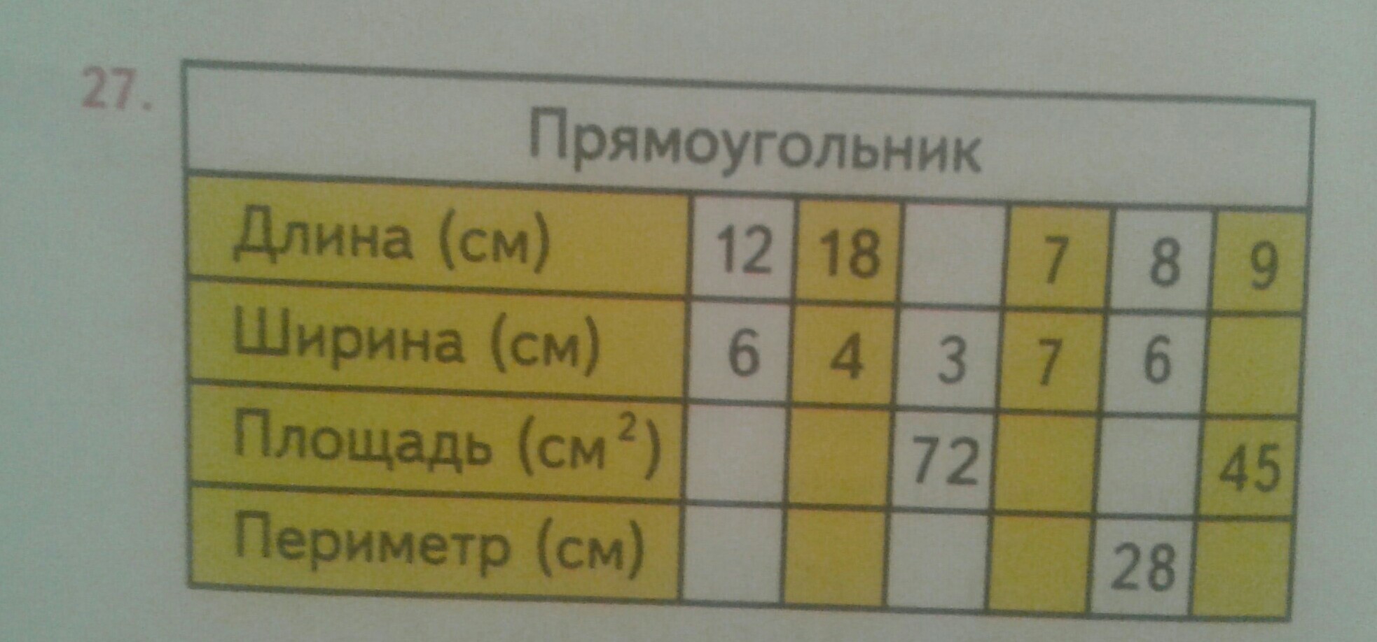 1 столб площадь 12*6=72 см2 ,периметр (12+6)*2=36 см .2 столб площадь 18*4=72 см2, периметр (18+4)*2=44см , 3столб 72:3=24 длина , периметр (24+3)*2=54 см , 4 столб 7*7=49 см2 площадь, периметр (7+7)*2=28см , 5 столбик площадь 8*6=48 см2, 6 столбик ширина 45:9=5 см, периметр (9+5)*2=28см