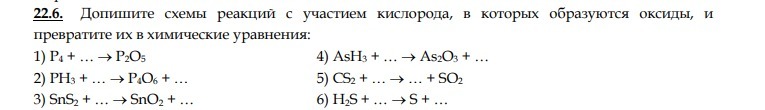 Допишите схемы реакций с участием кислорода, в которых образуются оксиды, и превратите их в химические уравнения: 1) P4 + … P2O5 4) AsH3 + … As2O3 + … 2) PH3 + … P4O6 + … 5) CS2 + … … + SO2 3) SnS2 + … SnO2 + … 6) H2S + … S + …