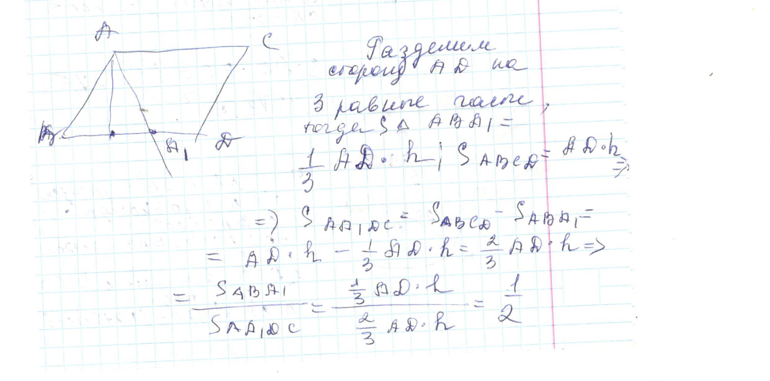 Разделите параллелограмм прямой,проходящей через его вершину,на два многоугольника, площади которых относятся как 1:2
