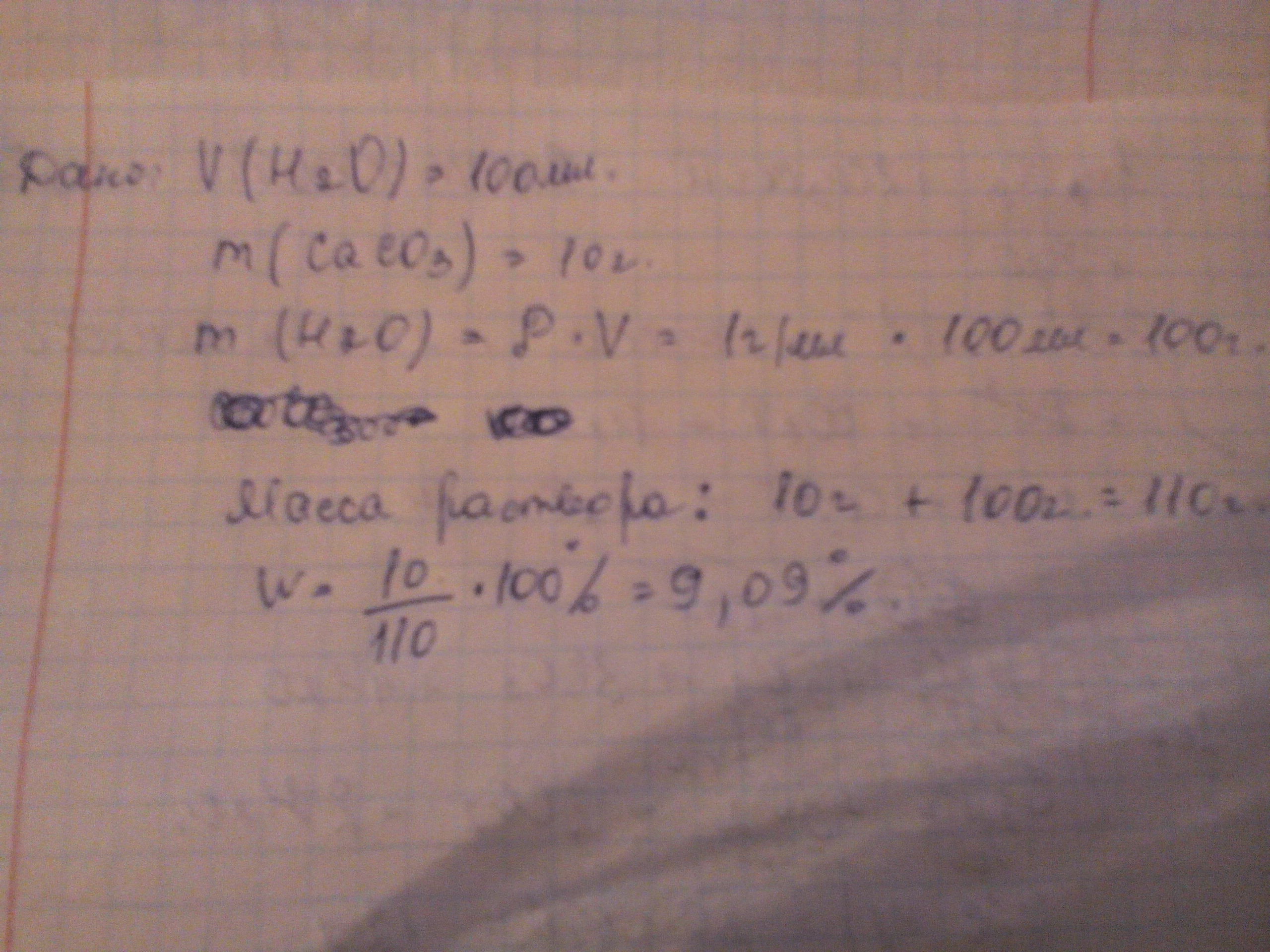 К 100 мл H20 добавили 10г карбоната кальция, какова массовая доля вещества в полученном растворе.
