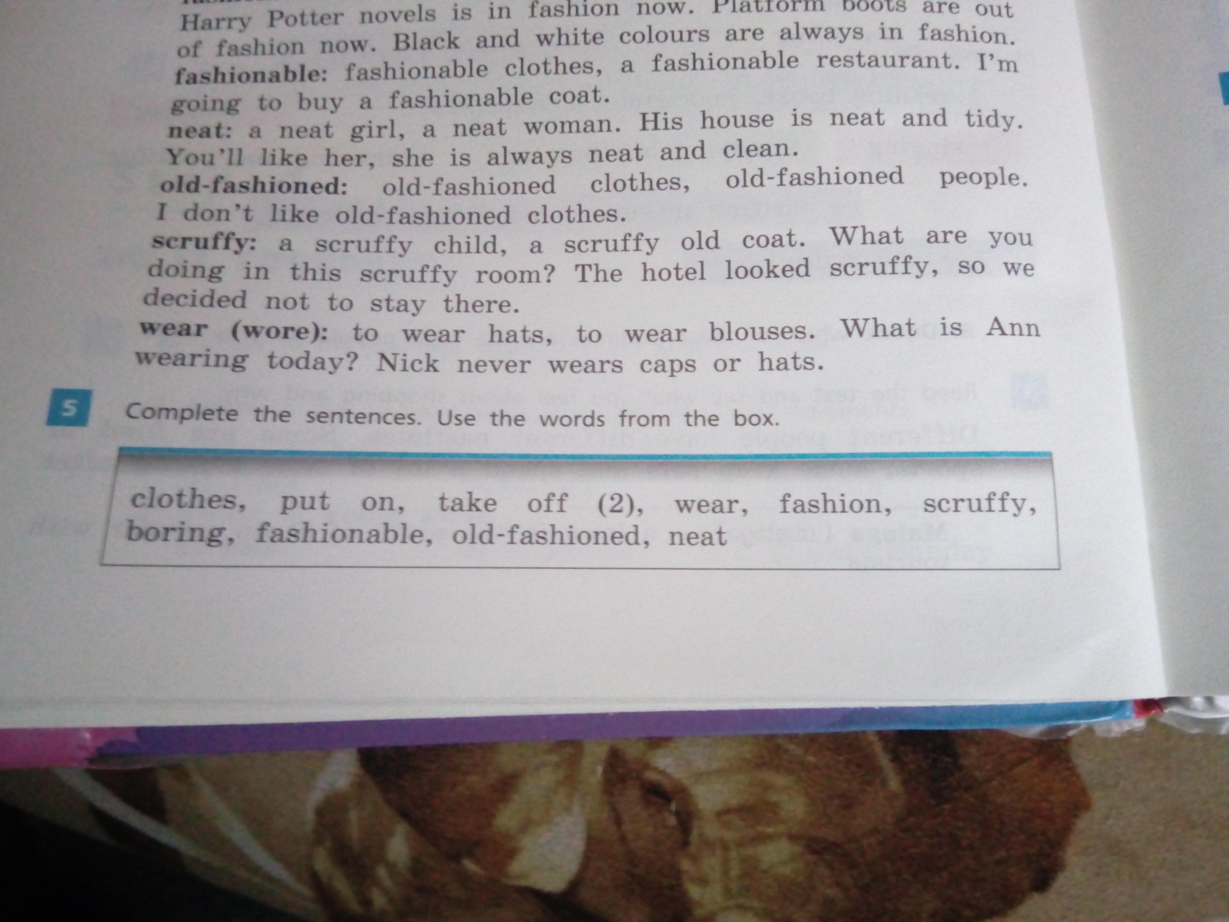 1 wear,2 neat, 3 clothes,4 fashionable,5 put on,6 take off,7 scruffy,old-fashioned,8put on,9 fashion,10 boring