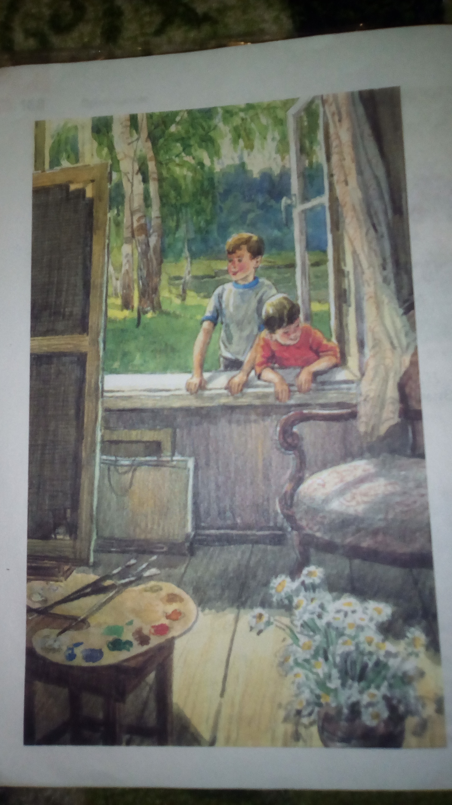 Летний день. Легкий ветер. Где же быть домику В Сыромятникова ? Конечно, на берегу местного пруда рядом с березками...Любопытные мальчишки подошли и тихонько заглянули в святая святых , в мастерскую художника. Старший - в белоснежной футболке с васильковым воротником, младший - в красной. У обоих на лицах - удивление. Маленький заметил в углу комнаты старинное кресло. Слева - табуретка. На ней - инструменты художника : кисти и краски. Справа - великолепная ваза с собранными накануне белыми с желтым глазком цветами- ромашками. Под окошком- холсты для будущих шедевров. На окне - простая занавеска. Вид на пруд, подернутый зеленой ряской, маленькую рощицу и таинственную лесную полянку чудесен.Так и хочется приехать в гости к В. Сыромятникову , чтобы лично увидеть, как он работает, узнать все тайны его мастерства.