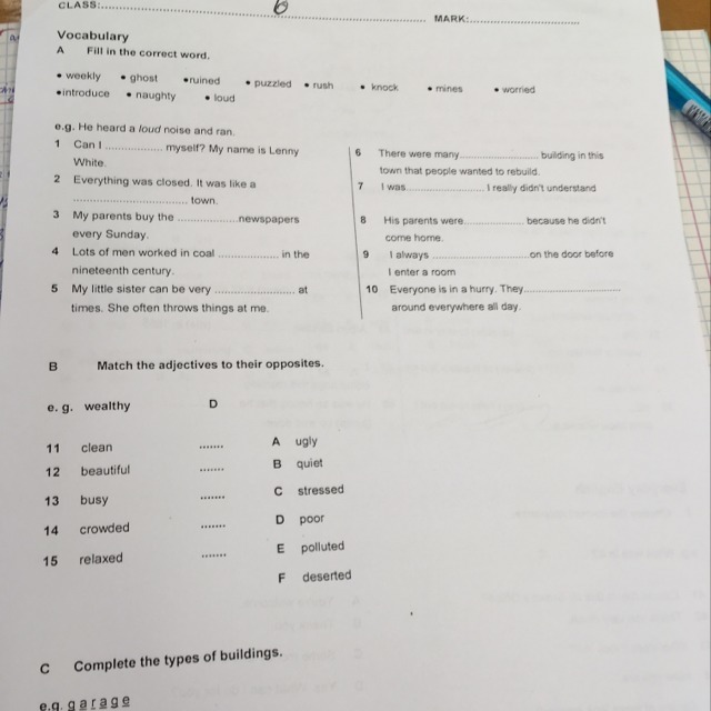 A: 1. introduce 2. ghost 3. weekly 4. mines 5. naughty 6. ruined 7. puzzled 8. worried 9. knock 10. rush