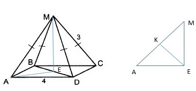 Теперь рассмотрим треугольник АМЕ. Угол AEM - прямой, т.к. E=проекция K на плоскость основания