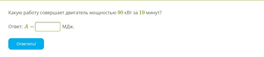Какую работу совершает двигатель мощностью 90 кВт за 19 минут?