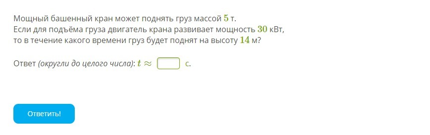 Если для подъёма груза двигатель крана развивает мощность 30 кВт,
