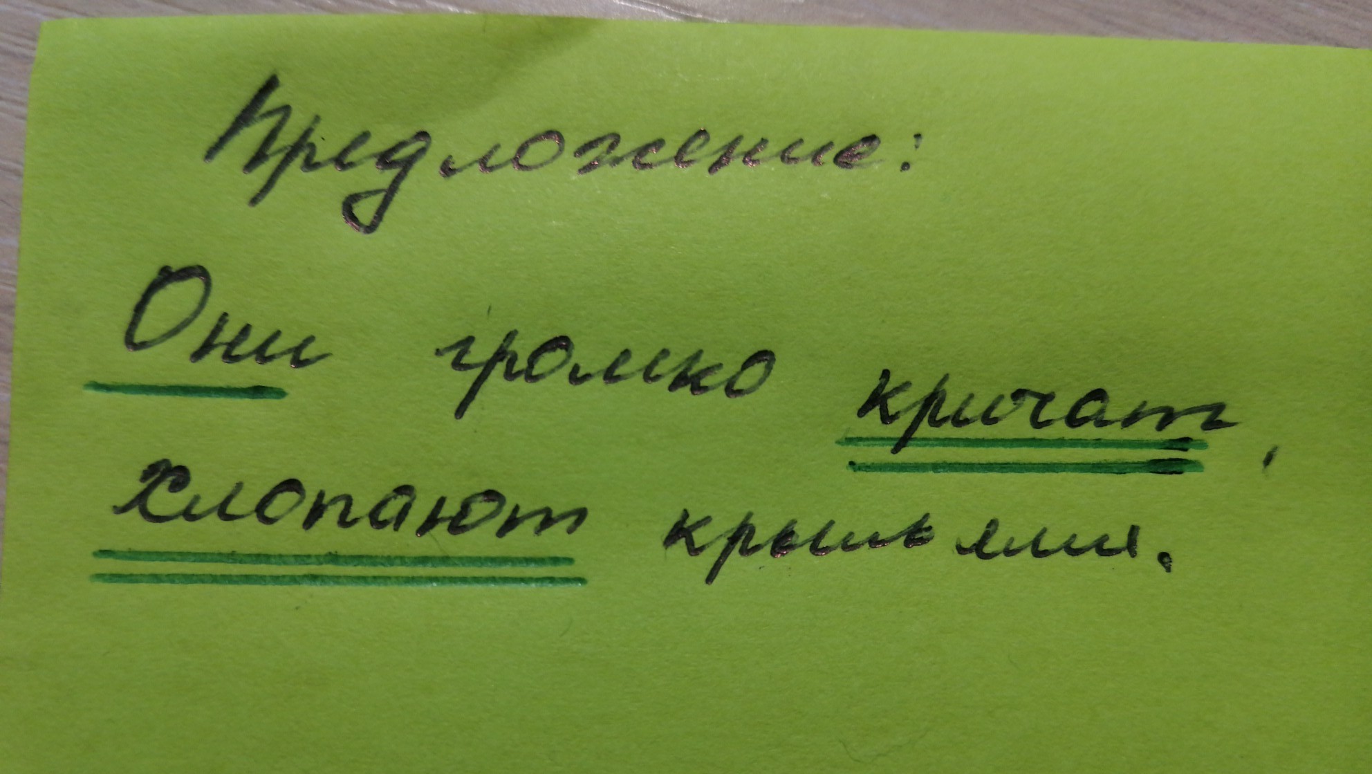 Предложение: Они громко кричат, хлопают крыльями. На фото всё подчёркнуто