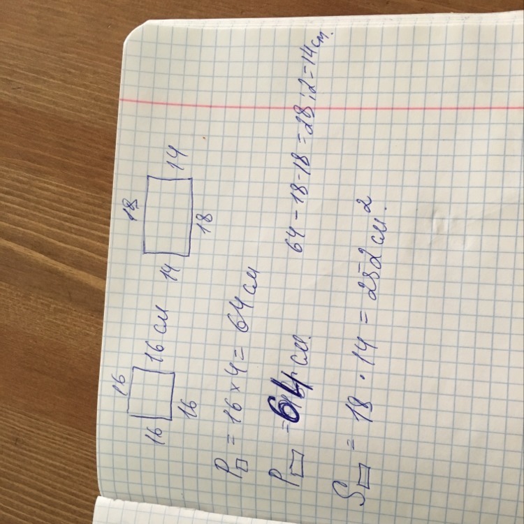 сторона квадрата равна 16см,.Длина прямоугольника ,периметр которого равен периметру этого квадрата равна 18см,Найдите площадь прямоугольника
