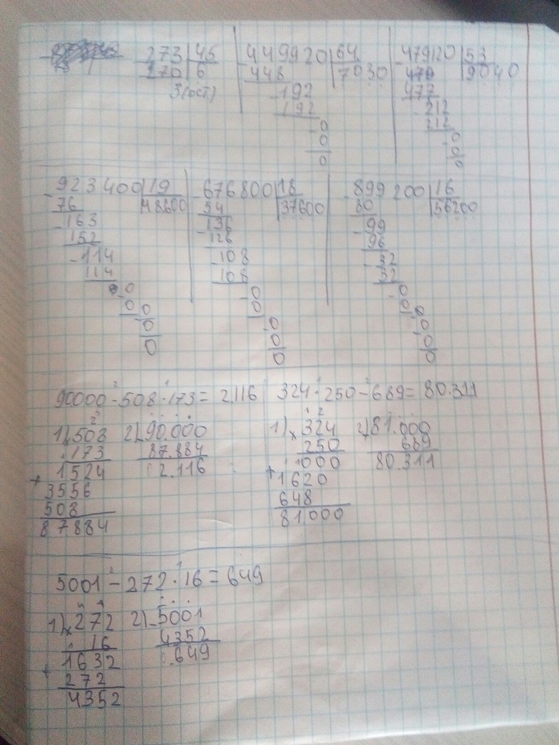Памагите пж в столбик, 273:45 , 449920:64,479120:53,923400:19,676800:18,899200:16, 90000 - 508*173 , 324*250-689 ,5001-272*16, пажалуйста за ранее спасибки))
