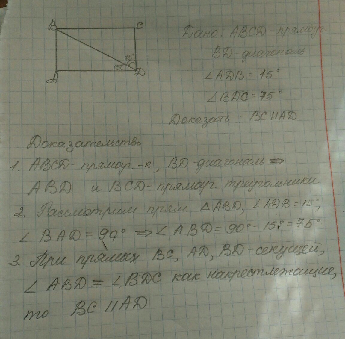 В прямоугольнике ABCD проведена диагональ BD. Углы, образованные этой диагональю, равны. Угол ADB = 15, угол BDC = 75. Докажите, что AD параллельна BC.