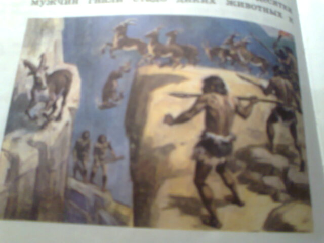 На этой картинке мы видим как первобытные люди занимаются охотой. По картинке можно определить как охотились древние люди: Они заманивали дикую стаю животных( смотри на картинке каких) на обрыв. Несколько стояли внизу а несколько гнали к обрыву. Затем вся стая падала из-за безысходности вниз где остальные охотники забирали их уже мёртвых животных. Я думаю так, там можешь подкаректировать но я бы так написала