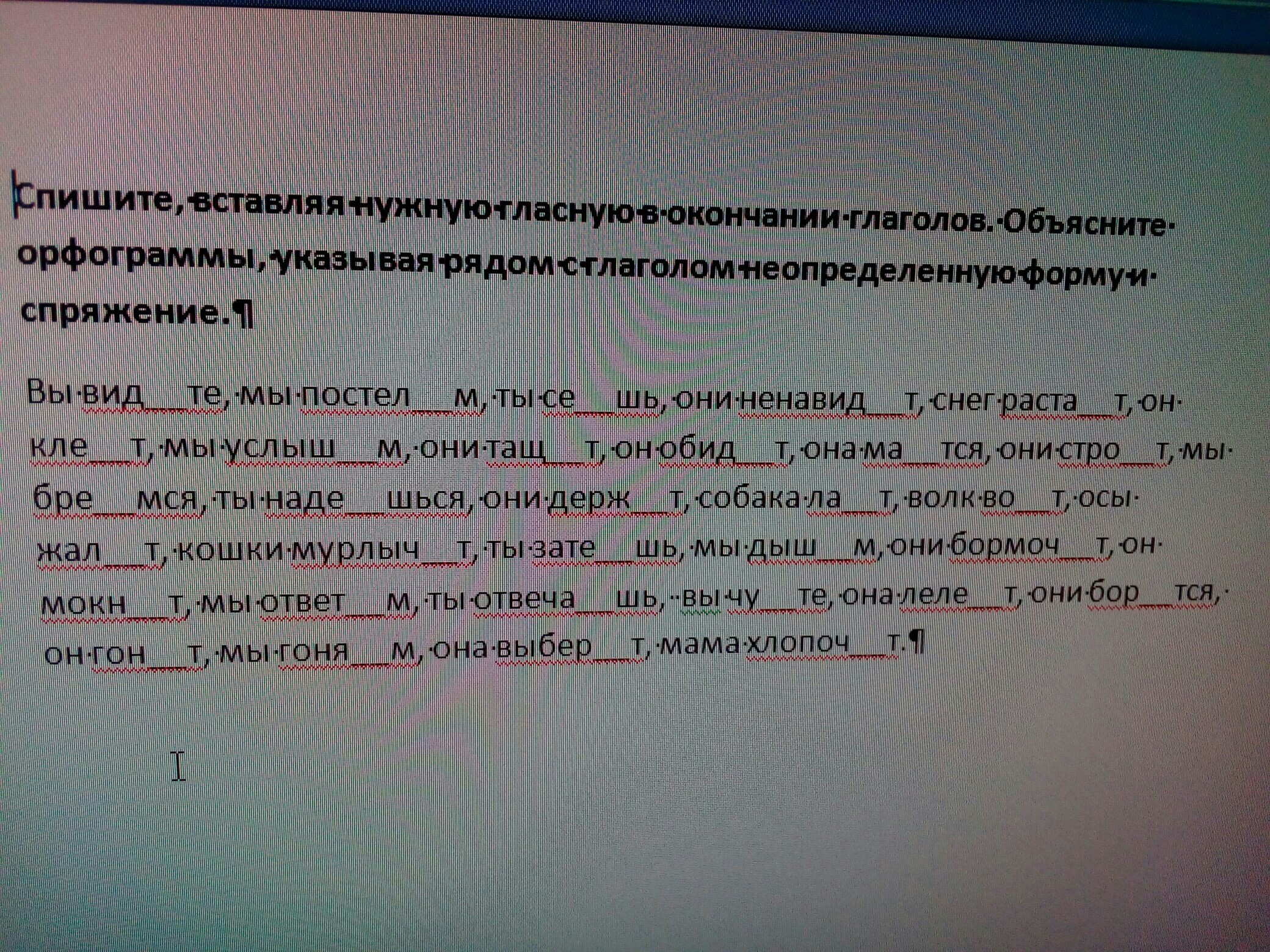 Вы-видите, мы постелим, ты-седишь, они-ненавидят, снег растает, он клеет, мы-услышим, они-тащят, он-обидает,они-строят,мы-бреемся,ты-надеешься, они-держат, собака-лает, волк-воет,осы-жалят,кошки-мурлычят, ты за едешь, мы-дышим, они-бормочят, он-мокнит, мы-ответем, ты-отвечаешь, вы-чуете, она-лелеет, они-борятся, он-гонит, мы-гоняем, она-выберает, мама-хлопочит.