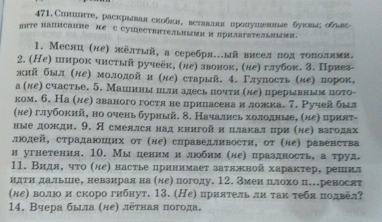 Месяц не желтый,а серебряный висел под тополями.Не широк чистый ручеёк,не звонок,не глубок.Приезжий был не молодой и не старый.Глупость не порок,а счастье.Машины шли здесь почти не прерывным потоком.На не званого гостя не припасена и ложка .Ручей был не глубокий но очень бурный.Начались холодные,неприятные дожди.Я смеялся над книгой и плакал при невзгодах людей,страдающих от несправедливости,от не равенства и угнетения.Мы ценим любим не праздность, а труд.Видя что ненастье принимает затяжной характер,решил идти дальше,невзирая на не погоду.Змеи плохо переносят не волю и скоро гибнут.Все)) устал уже писать)