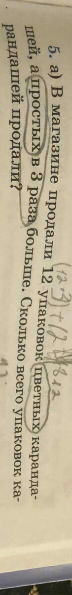 (12 × 3) + 12 = 48 упаковок карандашей продали.