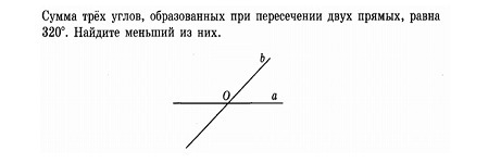 Сумма трёх углов, образованных при пересечении двух прямых, равна 320 градусов. Найдите меньший из них