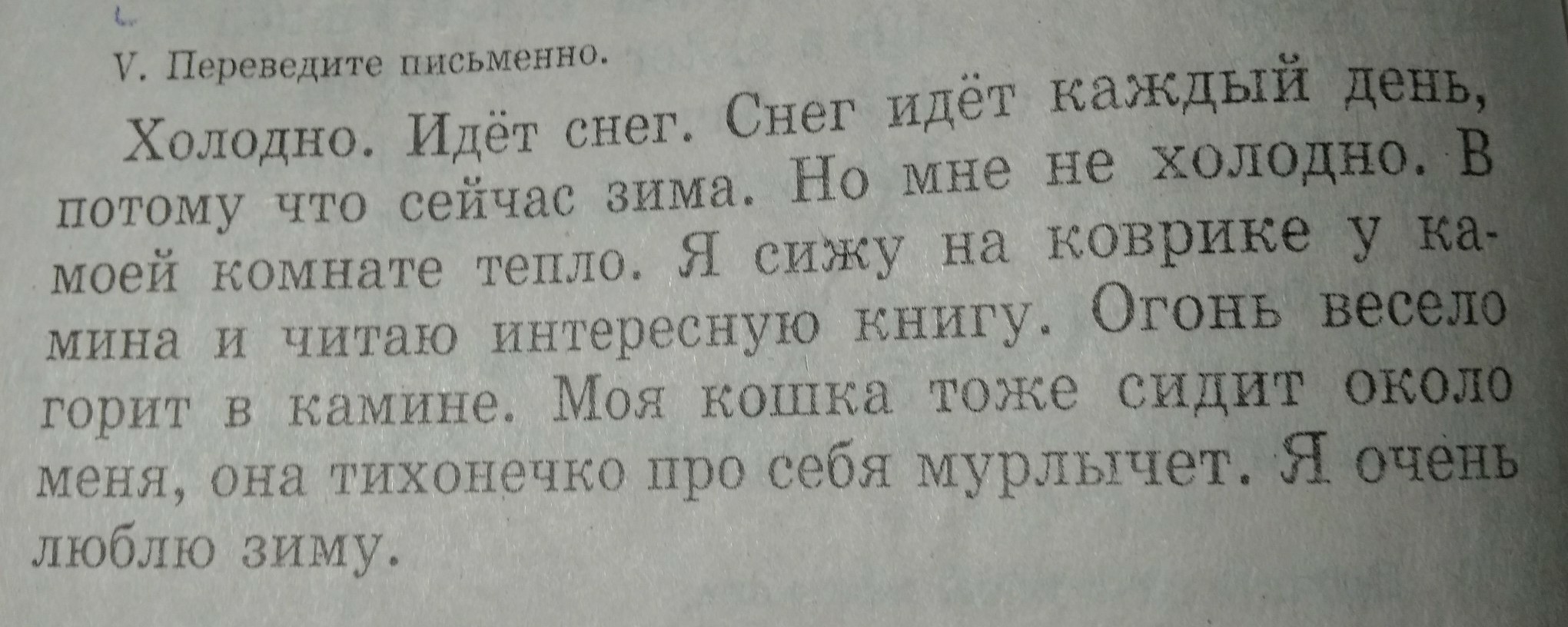 It's cold. It is snowing. It's snows every day because it is winter now. But I'm not cold. It's warm in my room. I'm sitting on the carpet and reading an interesting book. The fire is burning happily in the fireplace. My cat is sitting right next to me too, she is quietly purring to herself. I like winter very much.