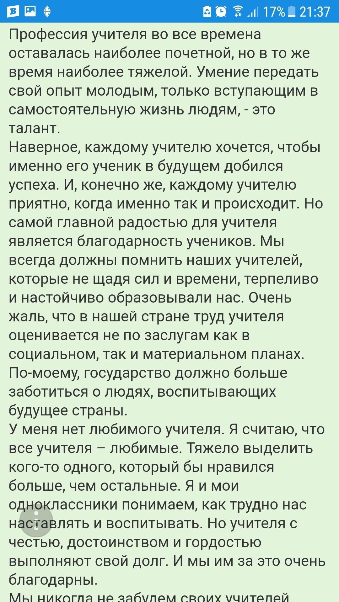 Мне кажется что проффесия учитель это незаменимая проффесия.Если бы не было учителей мы были бы безграмотными и глупыми.Учителя дают нам знания и вопитывают нас.Они для нас как вторая мать.Проффесия учителя является одним из важнейших проффесий в мире.