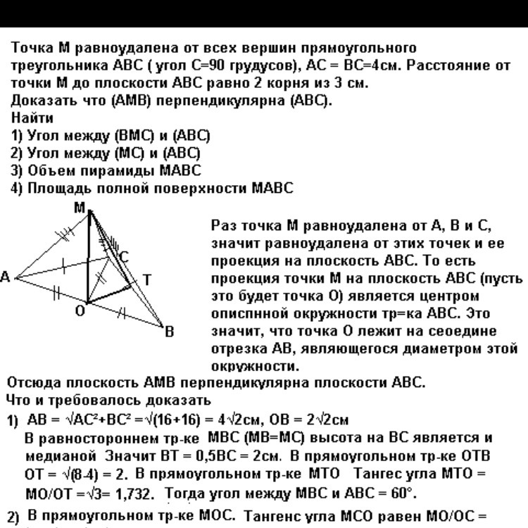 Точка О равноудалена от всех вершин прямоугольного треугольника АВС. АВ=ВС=4